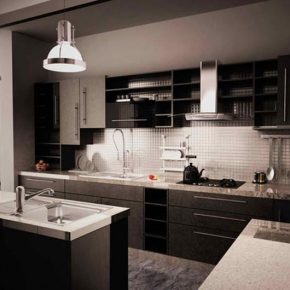 European design kitchen with black theme and gray counters