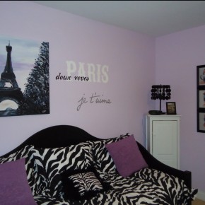 light pink wallpaper and zebra stripes bed decor with Paris pictures