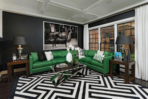 Snazzy-contemporary-living-room-with-geo-style-and-bold-green-couch