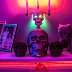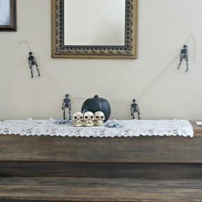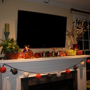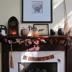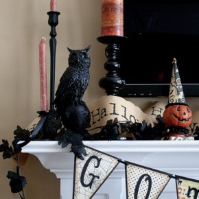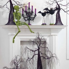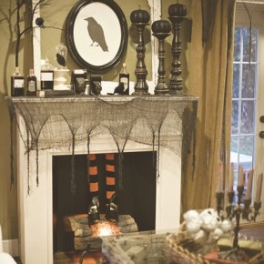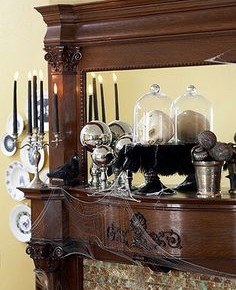 Spooky Halloween fireplace mantle with Halloween chrome candle holders