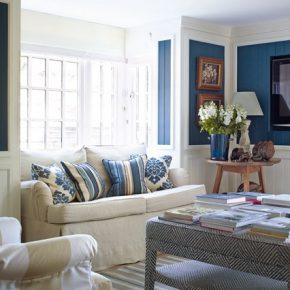 Blue and white furniture in small area for living room