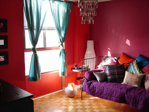 red-vibrant-moroccan-themed-bedroom-with-wrought-iron-bed-and-blue-curtains-also-traditional-style-lighting-fixtures by kari on May 12, 2016 in 0