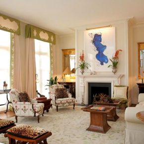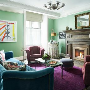 Contemporary modern Victorian room with floral accent chairs and artwork