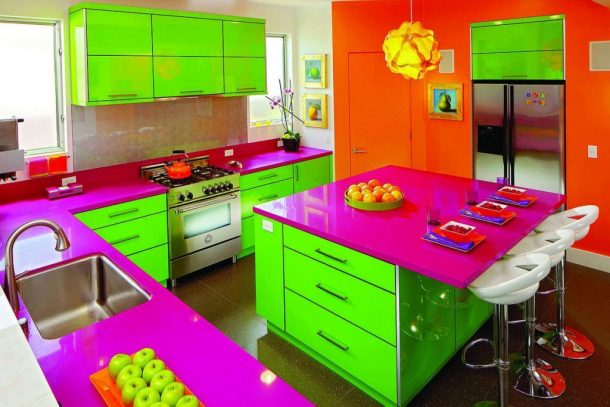 Playful-Kitchen-Plan-with-Nice-White-Modern-Stools-and-Hot-Pink-Countertop-Using-Lime-Green-Island