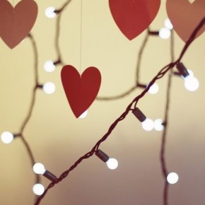 Romantic string lights with red hearts