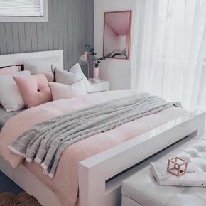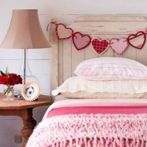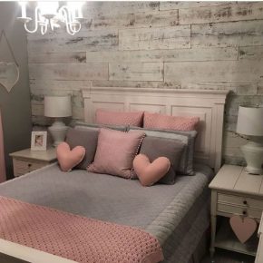 Beautiful pink and grey bedroom design with romantic heart pillows