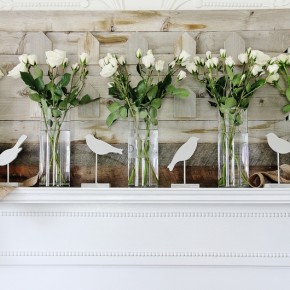 Spring mantel with flowers in white vases