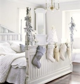 White winter bedroom scene with Christmas stockings hanging
