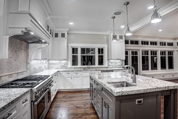 wooden-access-door-storage-ideas_kitchen-with-white-cabinets-and-black-granite_brown-mozaic-tile-backsplash_modern-sliding-glass-door_three-pendant-lamp by kari on February 26, 2018 in 0