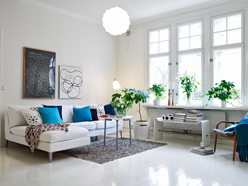 A Scandinavian Beauty Picture 3 beautiful living room | A cool Scandinavian palette of white walls may seem a little stark to some, but we think this example of blank canvas living perfectly illustrates how you can color a space with little more than your personality. Your existing collections of books, artwork, kitchenware and even good food packaging can create beautiful pockets of color around your home.Offset the clean lines of modern furniture by adding patterned throws, and don’t forget that plants always breathe life into a space