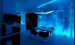 The blue lighting for design backlight choice is make some different look. Simple and minimalist chair table is look so great. Clean wall enhance the urban apartment with the stronger. But maybe we can se below the full detail and description from the designer.