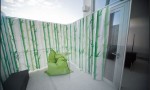 The result of moving the living quarters to the top floor was a penthouse-like living space flooded with light through the new “window to the city”. The inside floor covering is continued onto the balcony, which, together with cocoon-like textile walls on the balcony, makes inside and outside spaces melt into one.