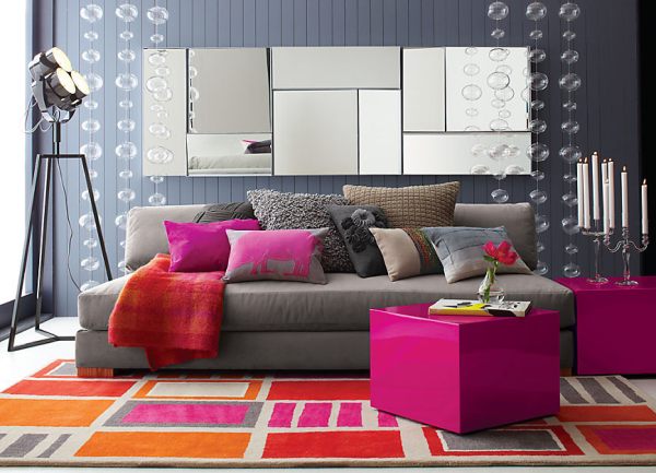 a gray living room with bright accents