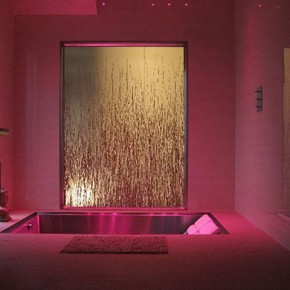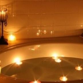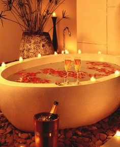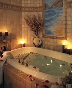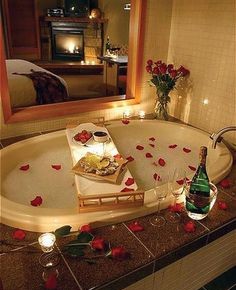 Romantic Valentines Day bathtub idea with flowers and candles and a ceramic wall