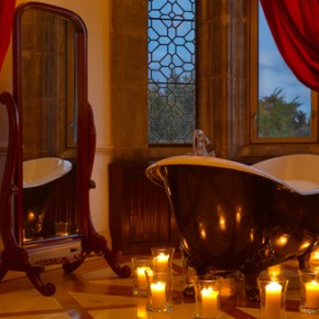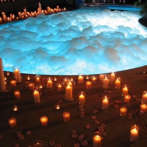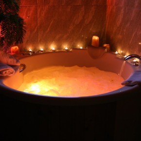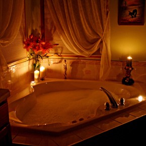 Romantic modern sexy Valentines day tub with candles and flowers.
